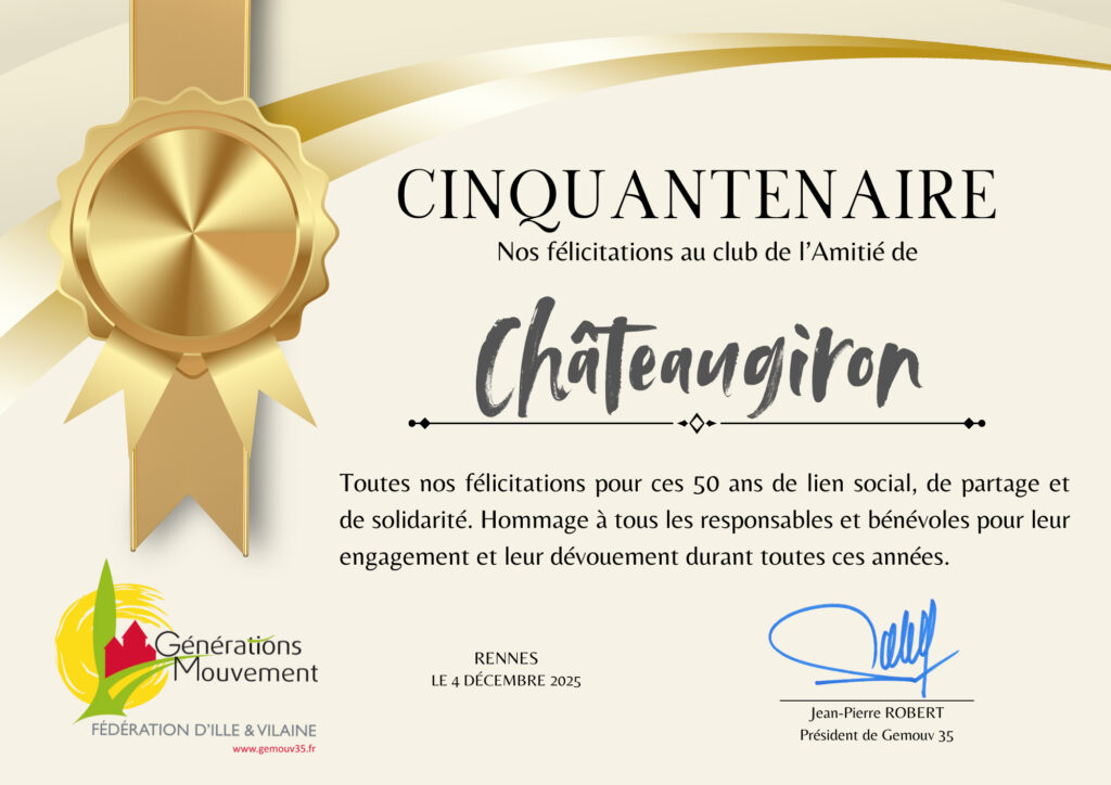 Jean-Pierre Robert, président de Générations Mouvement 35, a souligné la fidélité et la vitalité du club, saluant l’engagement des responsables et bénévoles qui se sont succédé depuis 50 ans. À cette occasion, il a remis au président Cadieu le diplôme des 50 ans.